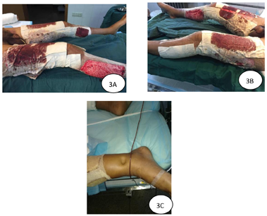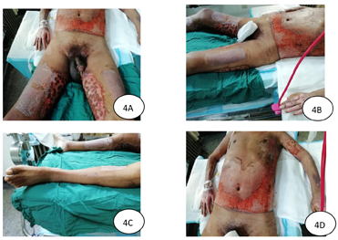患者烧伤面积大,既往有心功能不全的表现,病情危重,保护创面的同时积极补液抗休克、保护脏器、纠正低蛋白血症等对症处理;体表创面以深二度到三度为主,难以自愈,手术指针明确,需择期手术治疗。大面积深度烧伤创面,多选择分批、分次手术,患者躯干深度创面暂时保痂处理,先行手术四肢深度创面。第1次手术:2018年8月23日在全身麻醉(全麻)下行左上肢、双下肢散在25%烧伤创面切削痂+异种皮包扎术(术后常规治疗,患者病情尚稳定);第2次手术:2018年8月28日在全麻下行左上肢、双下肢25%创面异种皮除去、扩创+MEEK联合自体大张皮移植术(术后安返病房)。