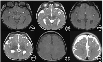实验室检查提示血常规、血生化、血氨、血乳酸等检查均无异常。视频脑电图(图1)提示:背景弥漫性慢波增多,全脑区可见大量高度失律。头颅磁共振成像MRI(图2):①巨脑回及无脑回畸形②双侧额顶叶硬膜下间隙增宽③双侧侧脑室增宽④透明隔间隙。Gesell发育量表测评:DQ 39.1。