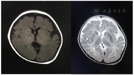 佩梅病是一种罕见的X连锁隐性性状遗传的早发性运动障碍,其特征为中枢神经系统髓鞘发育不良且不伴有神经细胞或轴突受累[4]。佩梅病主要由致病基因蛋白脂蛋白1(proteolipid protein l, PLP1)突变导致,PLP1基因缺陷可致髓鞘形成异常和少突胶质细胞死亡,最终影响大脑的正常发育。临床上以男性发病为主,主要表现为眼球震颤、进行性运动障碍、肌张力低下等。头颅MRI常表现为大脑半球、小脑和脑神经系统的中心白色物质为弥漫性T1加权低强度信号和T2加权高强度信号[5],提示脑白质髓鞘化不良。值得注意的是1岁以内的患儿由于大脑髓鞘化不充分,头颅MRI结果不具有特异性。1岁以后的患儿脑白质及内囊的髓鞘化倒退具有重要的影像学诊断价值[6]。遗憾的是,本例患儿1岁后未再做头颅MRI评估大脑发育情况。