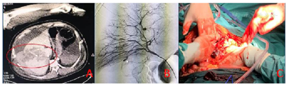 立即行右侧胸腔闭式引流,骨盆固定带有效固定后送入手术室进行抢救,拟行剖腹探查手术。床旁超声提示肝上间隙少量液性暗区,脾脏周围及腹腔未见明显液性暗区。腹腔诊断性穿刺未抽出血性液体。血红蛋白91 g/L,PT 20.2 s,APTT 78.8 s,D二聚体> 4.4 mg/L,FDP 109.3 mg/L。HGB 122 g/L,HCT 35%,FIB 1.47 g/L,PT-INR 1.07。决定给予输血治疗、补充血容量、氨甲环酸止血、气管插管、呼吸机辅助呼吸等保守治疗。经过2 h抢救,伤员心率126次/分,血压90/53 mmHg,复查HGB 68 g/L,HCT 15%,PH 7.08,Lac 8.4 mmol/L。继续输血治疗、补充血容量维持血压。共输注A型RH阳性红细胞悬液20单位,同型新鲜冰冻血浆2 400 ml,单采血小板2治疗量,冷沉淀10单位。又抢救2 h后,伤员心率136次/分,血压101/61 mmHg,期间多次评估及诊断性腹腔穿刺,均未抽出血性液体,转入ICU继续复苏。复查血红蛋白57 g/L,白蛋白12.9 g/L,PT 20.8 s,FDP 14.6 mg/L。