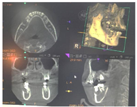 患者,女性,11岁,2018年3月以"右下后牙区囊肿及右上后牙残根2月余"为主诉就诊。患者约2年前治疗口内多颗坏牙,45行根管治疗,16行充填治疗,治疗后未定期复查,16牙冠逐渐脱落,于外院拍片检查发现16残根,右下后牙区囊肿。患者既往体检,无全身病史,父母均健康,无类似病史。检查见:16残根,近远中边缘深达龈下2~3 mm,颊舌边缘位于龈上1.0~1.5 mm,大量腐质。15,17未萌出,46和44之间间隙约2 mm(图1)。曲面断层片显示:16残根,根尖区见低密度影,15阻生,牙根发育Nolla 8期,17牙根发育Nolla 7期,18牙根发育Nolla 5期(图2)。44-46颊侧牙槽骨膨隆,质地硬,无压痛,未及波动感,85远中及牙合面大面积充填体,边缘欠密合,不松动。曲面断层片显示:85牙根大部分吸收,远中根剩余约1mm,根管内见根充影像,45牙轴偏向远中,牙根发育Nolla 8期,44远中至46近中范围可见大面积低密度影,边缘清晰,包绕于45牙颈部。CBCT显示:低密度影近卵圆形,大小约为1.0 cm×1.2 cm×1.4 mm,边界清楚,颊侧骨板薄(图3)。