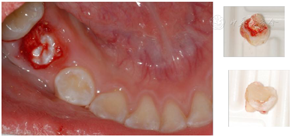 44-46颊侧牙槽骨膨隆,质地硬,无压痛,未及波动感。85大面积充填体,不松动,无肿胀瘘管。16残根,15,17未萌出。