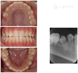 患者为11岁女孩,于外院检查发现右侧下颌区囊肿及左上后牙残根,无明显不适。右下第二乳磨牙2年前曾行根管治疗,右上第一恒磨牙曾行充填治疗。
