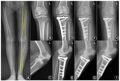 并发症:1例(双侧OWHTO)患者因左膝切口愈合不良于术后半年去除左胫骨内固定装置。