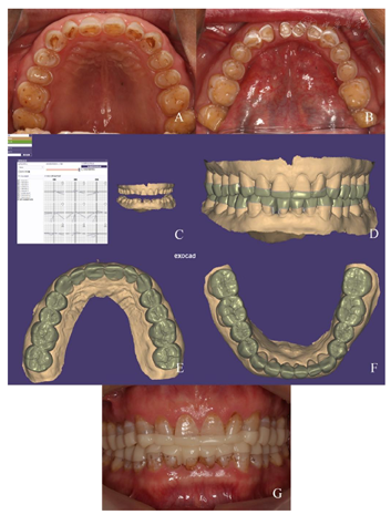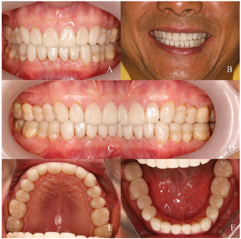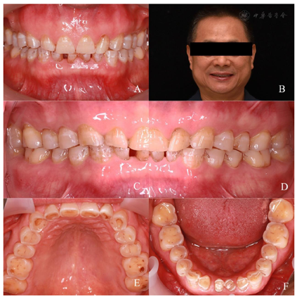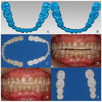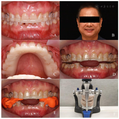 垫正面观 B 微笑像 C 上颌咬合面观 D升高咬合垂直距离 E 硅橡胶材料取咬合记录 F 模型上