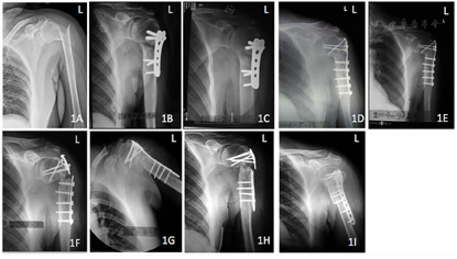 完善相关检查和术前准备后,排除手术禁忌,于2002年9月行左肱骨近端骨折切开复位钢板内固定术。术后1年复查,断端骨折线明显,少量骨痂生长,肱骨近端内翻畸形(图1B)。2004年2月(术后18个月)复查,患者患侧疼痛明显,X线检查提示肱骨近端内翻畸形,颈干角约122°,肱骨内侧距复位欠佳,骨折线明显(图1C)。诊断为骨不连,行翻修手术,拆除内固定并纠正复位,恢复内侧距连续性,更换三叶草型钢板。术后3个月(第1次手术后21个月)复查,X线片示:颈干角纠正(约139°),内侧骨痂生长稀疏(图1D)。术后7个月(第1次手术后25个月)复查,X线片示:复位丢失同上次复查,颈干角缩小(约135°)(图1E)。2005年8月(术后18个月,第1次手术后36个月),患者自觉左肩疼痛,复查X线片,提示骨折断端进一步内翻,颈干角缩小(约118°),三叶草型钢板断裂(图1F)。再次翻修手术,更换坚强肱骨近端锁定钢板,并采用人工骨植骨(图1G)。2006年1月(第3次手术后5个月,第2次手术后23个月,第1次手术后41个月),患者再次发生左肩肿痛,复查X线片提示骨折断端移位,人工骨吸收,肱骨近端锁定钢板于骨不连平面断裂(图1H)。第3次翻修手术更换肱骨近端锁定钢板,近端内侧自体腓骨移植支撑肱骨头(图1I)。