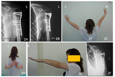 第4次手术后1年随访,X线检查提示骨折愈合。左肩关节功能明显改善,肩关节外展180°,内收45°,前屈170°,后伸60°。2021年10月随访(第4次手术后14年,第1次手术后19年),左肩主动前屈及外展均达到正常活动范围。