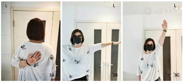第4次手术后3个月(第3次手术后8个月,第2次手术后26个月,第1次手术后44个月),复查X线片示骨折端吸收,肱骨头变形但无缺血坏死,颈干角纠正(约162°)(图2A)。第4次手术后1年(第3次手术后17个月,第2次手术后35个月,第1次手术后53个月),复查X线片示骨折愈合,颈干角维持在约168°,肱骨头未见缺血坏死(图2B)。肩关节功能随访,左肩主动外展约180°,内收约45°,前屈约170°,后伸约60°,肩关节内旋时拇指尖达第5胸椎水平(图2C~2E)。Constant-Murley肩关节功能评分为90分(术前为15分,满分100分),疼痛视觉模拟评分法0分(术前10分,最高10分)。2019年4月随访(第4次手术后13年,第1次手术后17年),X线提示颈干角约145°,肱骨头未见缺血坏死(图2F)。2021年10月随访(第4次手术后14年,第1次手术后19年),左肩主动前屈及外展均达到正常活动范围(图3)。