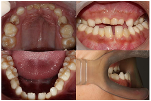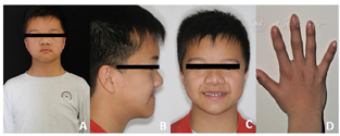 ①临床检查:口外检查见头颅增大,眼距增宽,鼻梁塌陷,双肩陡峭下垂,双肩可向前相互靠拢,手部可见远端指骨较短;口内检查见混合牙列,31、41、16、26、36、46萌出,37、47部分萌出,剩余乳牙滞留,全牙列反