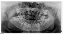 诊断:①颅骨锁骨发育不全;②54、64慢性根尖周炎;③51-55、61-65、73-75、82-85乳牙滞留;④11-15、21-25、33-35、42-45埋伏阻生;⑤上下颌骨内13枚埋伏多生牙。