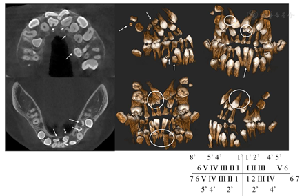 ,反覆盖10mm,双侧尖牙及磨牙近中关系;51、61扭转,上颌牙弓狭窄,腭盖高拱,31、41间可见间隙约5mm(图2)。(3)影像学检查:①曲面断层片示多数乳牙滞留,恒牙迟萌,多颗埋伏阻生多生牙。54、64远中邻面低密度影及髓,牙根吸收(图3);②CBCT示全口恒牙排列紊乱,上下颌骨内可见13颗多生牙,均位于恒牙胚舌腭侧,形态类似相邻恒牙胚(图4);③头颅侧位片示头颅侧位片示上颌骨发育不足(NA-Apo:-5.9°),下颌前突(SNB: 98.2°;FH-NPo:90.0°),骨性III类错