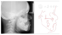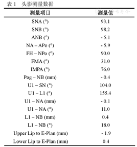 患者身高160cm,体重56kg,神志清,合作,智力正常。(1)口外检查:双肩陡峭下垂,肩关节活动度大,双肩可向前相互靠拢,两侧锁骨端缺如明显可见,手部可见远端指骨较短。头颅增大,面骨相对较小,眼距增宽,鼻梁塌陷;面型对称,颞下颌关节未见明显异常;面中份发育不足,III类骨性错