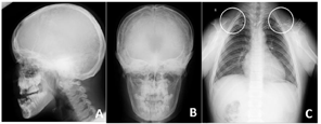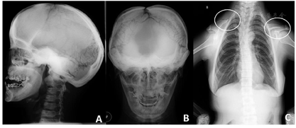畸形(ANB:-5.1°;FMA:31.0°)(图5)(表1);④头颅正位片示颅缝轻微增宽;⑤胸片示双侧锁骨远心端发育不足(图6)。