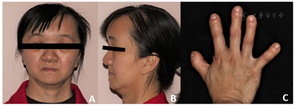 通过询问病史及临床检查发现,患者母亲有类似的特殊面容和骨骼发育异常(图7、图8),家族谱系图见图9。