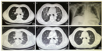 患者男,76岁,因"发热、气促1周"入院。患者于2020年8月24日无明显诱因出现发热,最高体温38.8℃,自感气促,活动后及平卧位明显,休息及坐位可缓解,伴乏力,干咳,口服"尼美舒利"可退热数小时。至当地社区医院予抗感染("左氧氟沙星、头孢米诺")治疗后仍有发热,且气促加重。于2020年8月29日至我院急诊就诊,完善胸部CT,对比起病前我院胸部CT(图1A),现片示:双肺弥漫性改变,感染?肺水肿?双侧少量胸腔积液(图1B);血常规提示白细胞计数10.9×109/L、中性粒细胞计数9×109/L,淋巴细胞计数0.7×109/L,予美罗培南抗感染等处理后,症状较前缓解,最高体温37.7℃,遂于2020年8月30日以"重症肺炎、呼吸衰竭"收入我科。患者既往高血压病史20余年;于2020年6月18日诊断为弥漫大B细胞淋巴瘤,目前R-CHOP方案规律化疗中。无烟酒史、冶游史,家族中无遗传病及肿瘤病史。入院体查:体温36.5℃,脉搏118次/分,呼吸33次/分,血压141/51mmHg。口唇微发绀。双肺呼吸音低,可闻及湿啰音。心率118次/分,律不齐,可闻及早搏,5次/分,双下肢轻度水肿。