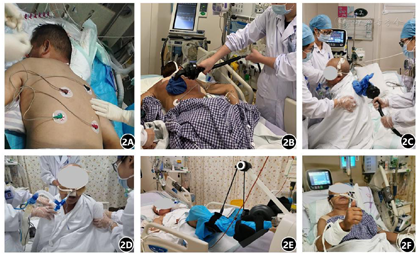 患者2020年8月30日11时收入我科呼吸ICU后,气促明显,血气分析氧合指数<200,立即予无创呼吸机辅助通气,同时予复方磺胺甲噁唑(1.44g口服每6小时1次),联合卡泊芬净(首剂70mg静滴每日1次,此后50mg静滴每日1次)抗肺孢子菌治疗,美罗培南(1g静滴每8小时1次)联合莫西沙星(0.4g静滴每日1次)广谱抗细菌、非典型病原体感染、更昔洛韦(0.25g静滴每12小时1次)抗病毒治疗,余辅以营养液、白蛋白营养支持,免疫球蛋白增强抵抗力,PiCCO血流动力学监测,容量控制、保护胃黏膜、抗凝、护肝、护肾等脏器保护、并发症预防等对症支持治疗。此后患者仍发热、气促,氧合指数下降至68,于2020年8月31日10时改气管插管接有创呼吸机辅助联合俯卧位通气(图2A)后,10小时氧合指数上升至150左右,完善支气管镜检查留取BALF送检常规培养及宏基因组下一代测序(metagenomics next generation sequencing,mNGS),结果回报示:耶氏肺孢子菌特异性序列数89条,支持耶氏肺孢子菌肺炎诊断,继续原方案抗肺孢子菌治疗;无巨病毒感染证据,停用更昔洛韦。2020年9月2日,患者体温恢复正常,氧合指数升至270左右。2020年9月4日复查胸部CT示:双上肺、右中肺感染较前吸收,双下肺感染较前稍微增多(图1D),G试验182.56pg/mL,降钙素原2.37ng/mL,继续当前方案治疗,同时予踩单车、带管坐立、拍背排痰等康复训练(图2B,图2C,图2D,图2E)。2020年9月6日复查血气分析示氧合指数297,充分评估后予撤离呼吸机、拔除气管插管,序贯经鼻高流量湿化氧疗(high-flow nasal cannula oxygen therapy, HFNC)(图2F),同时抗菌药物降阶梯为哌拉西林他唑巴坦4.5g静滴每日1次,余方案同前,此后氧合指数维持在400左右。2020年9月8日复查胸部CT示:双肺感染较前吸收(图1E),G试验正常(39.43 pg/mL),降钙素原基本正常(0.279 ng/mL),综合评估前期治疗有效,病变吸收明显,于2020年9月10日停用卡泊芬净,9月14日出院。