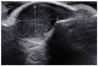 患者10余年前无明显诱因出现左侧第三足趾疼痛,重度疼痛,呈间歇性发作,性质为针刺样,阴天、劳累、受冷、情绪激动可加重疼痛,多次就诊外院予口服镇痛药物、理疗、针刺治疗等效果不佳。3个月前行针刺治疗后疼痛范围增大,重度疼痛,程度较前加重。体格检查:左侧第3足趾隆起变形,内侧缘不规则;触摸甲板根部诱发剧烈疼痛,NRS评分9分。双下肢皮肤颜色、温度无明显异常。肌骨超声:左足第三趾甲深方低回声包块。
