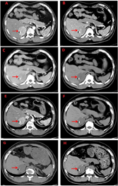 注:2012年4月20日肾上腺增强CT:动脉期(图A),门脉期(图B),平衡期(图C),平扫(图D);2012年12月26日肾上腺增强CT动脉期(图E),平扫期(图F);2015年8月19日肾上腺CT平扫(图G);2018年4月24日肾上腺CT平扫(图H)。右侧肾上腺占位(如箭头所示)