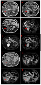 注:2021年4月1日双侧肾上腺磁共振平扫+增强:A:T1WI同相位;B:T1WI反相位;C:T2WI;D:T2WI SPIR;E:DWI b=0;F:DWI b=800;G:T1WI;H:增强动脉期;I:增强静脉期;J:增强延迟期。右侧肾上腺占位(如箭头所示)
