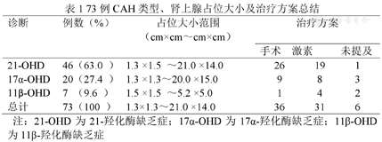 73例CAH类型、肾上腺占位大小及治疗方案总结