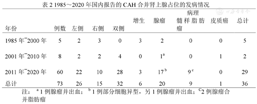 1985~2020年国内报告的CAH合并肾上腺占位的发病情况