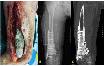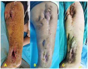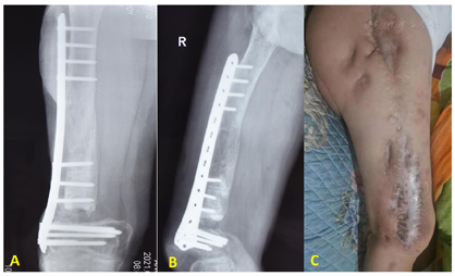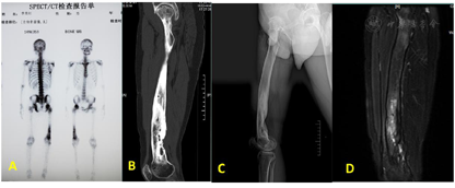 患者男性,17岁,因"右侧股骨反复流脓10年"入院。患者诉10年前无明显原因出现高热,继而出现右大腿疼痛、肿胀。当时到当地医院就诊,诊断为:"右股骨血源性骨髓炎",行股骨开窗减压、冲洗引流治疗,病情好转后出院,十年间患者反复多次出现发作,经过输抗生素治疗后有所缓解,病情时好时坏,期间多次到当地医院及省会某医科大学附属医院进行骨髓炎手术治疗(具体手术方案不详,共10次手术),一直无法根治,且逐渐出现髋膝关节僵直,活动障碍,2019年再次复发来我院就诊(见图1A),予病灶清创,碘纺纱条填塞治疗,治疗后感染得到控制(见图1B)。术后1年半大腿远端再次复发入院(见图1C)。入院查体:一般情况及全身情况良好,生命体征平稳,行走跛行,右侧髋膝关节僵直,活动障碍,右股骨上段外侧可见陈旧性手术瘢痕,愈合良好,局部无红肿及压痛,无叩击痛,右股骨中下段外侧可见约4cm*0.8cm窦道,深达股骨髓腔,窦道内有流脓,周围稍红肿,压痛及叩击痛明显,无高血压、糖尿病等病史,无过敏史,无冶游史,家族中无遗传病病史。