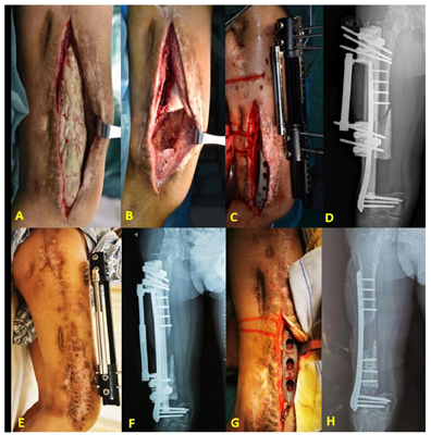 第2阶段在第1次手术8周后进行。根据以下标准评估感染是否控制:(1)全身无发热表现,患者精神状况及感觉良好。(2)手术部位及周围无感染体征:伤口愈合良好、无疼痛、发红、渗出或脓液等。(3)实验室指标正常:包括红细胞沉降率(ESR)、C反应蛋白(CRP)、降钙素原(PCT)和白细胞(WBC)计数正常。如果同时达到上述指标,则认为感染控制,予二期手术重建。在原切口处切开,纵向切开诱导膜(图4A)。然后在抗生素水泥涂层的锁定钢板上剥离覆盖的骨水泥,去除骨蜡暴露螺钉并将钢板螺丝钉及骨水泥完全取出(图4B);彻底冲洗,更换长股骨远端外侧钢板,远近端各打入螺丝钉固定,并辅助可延长单边外固定架固定,在股骨中上段用微型截骨器截骨(图4C,图4D),截骨后通过单边外固定架搬移骨块(每天1mm,分3-4次进行),待断端会师后,再次切开伤口会师部分,在原钢板上通过电钻钻孔,植入2枚锁定螺丝钉固定搬移骨块,会师端取自体髂骨植入,等待骨质矿化及愈合(图4E,图4F,图4G,图4H)。