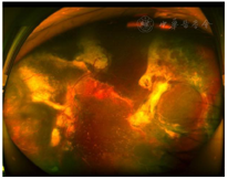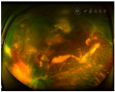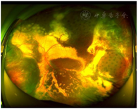 2019年8月30日:患儿第1次外科手术后8个月回院复查,诉近1个月来左眼视力明显变差,体检:Vos:HM/30 cm,Ios:16 mmHg;左眼周边视网膜可见大量视网膜前增殖膜,鼻下原渗出性视网膜脱离区域可见致密纤维膜覆盖(图8、图9)。