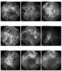 FFA检查:局灶视网膜毛细血管扩张、多发粟粒状动脉瘤及大片毛细血管无灌注区(图2)。