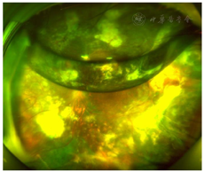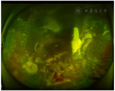 裂隙灯检查:双眼眼前节及右眼眼底检查未见明显异常,左眼眼部检查见大量黄白色渗出及点片状出血,颞侧可见视网膜下增殖膜,鼻下方见局部视网膜球形隆起(图1)。