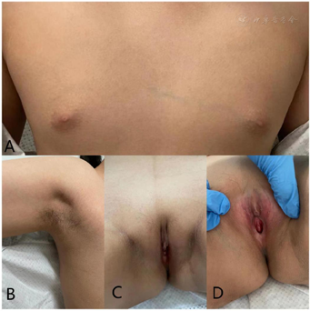 患者第二性征逐步发育,乳房增大,阴毛、腋毛生长。
