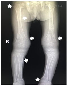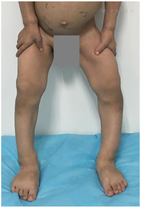 入院体格检查:身高85.5 cm(<-3SD),体重11.75 kg(<-3SD),神志清,乏力,非匀称型身材矮小,皮下脂肪菲薄。方颅,前额宽大突出。双眼轻微内斜视,视力正常,眼球运动正常。双侧耳位偏低,耳廓正常。牙列不齐,伴龋齿,脸颊饱满。肋骨外翻,7~10肋可见肋骨串珠,心肺查体未见明显异常,腹部膨隆。四肢短小,可见手镯征、脚镯征,双膝内翻,膝间距8 cm,四肢肌力Ⅳ级,肌张力减低(图1)。