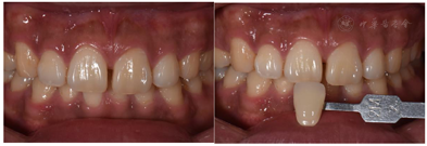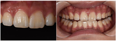 11、21贴面试戴,邻接可,外形佳,边缘密合,色泽与天然牙匹配,患者满意同意粘接,粘结后检查正中颌、前伸颌及侧方颌,咬合无明显异常。粘结后3个月复诊检查,11、21牙邻面贴面固定在位无折裂,边缘密合且无明显着色、修复体颜色无明显改变,检查正中颌、前伸颌及侧方颌,咬合无明显异常。