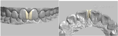 治疗计划为11、21贴面修复(邻面贴面)或正畸治疗。患者选择行贴面修复;龈上洁治,排龈,备牙前进行常规术前照相及比色(VITA2M2)。牙体预备:由11、21近中面扩展至唇近中线角,预备量约0.3 mm,基牙颈部预备与牙龈外形保持一致,肩台呈浅凹形,比色(VITA2M2)口扫;贴面试戴,邻接可,外形佳,与牙面边缘密合,色泽与天然牙匹配,患者满意同意粘接,粘结后检查正中颌、前伸颌及侧方颌,咬合无明显异常。见图3,图4,图5,图6,图7。