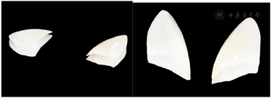邻面贴面仅对牙齿的邻面部分进行牙体预备,最大限度的减少了对牙体组织的磨除量,满足了患者少磨牙的心理需求。同时,在其牙体预备过程中,越过唇舌面的线角的边缘线可以在重新塑形牙体外形的同时可以增加固位以及改善邻接。由于邻面贴面仅覆盖小部分牙面,所以修复体的颜色、质地和透光性都要应与天然牙相适应,以达到贴面与牙面在粘结区域自然过渡,以假乱真的程度,这也满足了患者对美学效果的需求。故对修复体的精度要求较高,要求术前拍摄记录和比色、粘接材料颜色的选择精确,同时制作过程中及时与技师的沟通交流,以达到较好的美学修复效果。