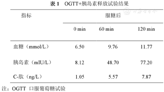 长期规律监测三餐前、三餐后2 h以及睡前血糖,患者FBG及餐前血糖水平偏高,FBG水平7.2~10.0 mmol/L,餐后2 h血糖8.0~12.0 mmol/L,睡前血糖7.0~10.0 mmol/L,无反复低血糖发作。HbA1c水平均在正常范围(3.7%~5.2%)。平均血糖水平明显与患者同期的HbA1c水平不相匹配,且患者无贫血情况,患者血红蛋白水平130~150 g/L。增加患者糖化白蛋白(glycated albumin,GA)水平的监测,GA为22.7%。于2020年4月21日行RBCs呼气试验,报告提示其RBCs为21 d,明显低于正常参考值范围( ≥75 d)。口服葡萄糖耐量试验(OGTT)+胰岛素释放试验检查结果见表1。患者肝、肾功能与血脂检测、血常规检查均无异常,尿常规检测均为阴性。