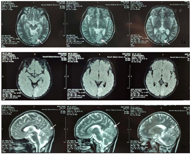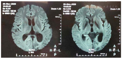 患者,女性,37岁,主因"间断抽搐发作36余年,加重5月余"于2020年11月24日就诊于河北医科大学第二医院神经内科。患者于6月龄时出现抽搐发作,表现为双眼向右上偏斜,四肢抽搐,伴意识不清,呼之不应,持续约数小时缓解。后此症状间断发作,表现同前,每次共3 h左右,发作频率约1次/20 d,共发作3次后未再发作。8月龄时出现发作性肢体活动障碍,表现为哭闹时仅一侧肢体活动,意识清楚,偏瘫侧肢体软,左右侧肢体交替发作,单侧偏瘫持续3天左右交替至另一侧,每次共持续1周左右,发作频率约半个月1次,就诊于当地医院,诊断为"低钙抽搐",给予补钙治疗,症状未见明显好转。1岁半时就诊于北京数家医院,于首都医科大学宣武医院完善头颅CT检查未见明显异常(具体不详),予以口服药治疗(具体不详),服用完后自行停药。后间断就诊于当地医院,诊断为"癫痫",15岁左右开始口服抗癫痫药物(具体不详)。11年前(26岁时)口服卡马西平0.2 g、2次/d,出现发作性肌张力障碍,表现为双上肢伸直,双手腕屈曲外旋,偶伴头眼右偏,意识清楚,为成簇发作,约半个月1簇,3~5 d/簇,数次/d,每次持续约数分钟,月经前或情绪不稳定时易发作;交替性偏瘫发作症状逐渐演变为发作时偏瘫侧肢体伴有强直性肌张力障碍,右侧肢体发作时症状常较左侧重。逐渐停用卡马西平(共服用数月),上述症状仍间断发作,发作表现及频率同前,就诊于北京数家医院,于北京三博脑科医院完善头颅核磁共振、24 h视频脑电图、48h视频脑电图和脑磁图等检查,家属回忆视频脑电图示未见癫痫样放电,头颅核磁共振示有病灶,脑磁图示病灶位置较深不宜手术(因检查结果及报告丢失,具体不详),诊断为"运动障碍性疾病",予以口服美多芭治疗,症状未见好转,数月后自行停用。此后数年间患者除交替性偏瘫发作、肌张力障碍发作外间断于清醒状态下出现全面性强直-阵挛发作2次,发作前有头痛先兆,每次持续约30 min。入院5个月余前患者于清醒状态下突然出现右侧肢体抖动,伴头眼右偏,口角向右侧偏斜,意识丧失,伴流涎,持续约数小时,就诊于当地医院查头颅MR示左侧颞顶枕叶病变,性质待定,后此症状间断发作,偶伴小便失禁,发作前有恶心、呕吐等先兆,发作频率约1次/周,患者逐渐无法自行行走;入院3个月前患者发作形式变化为右手右脚抖动,伴右侧面肌、嘴角抽搐,每次持续约数小时,频率约1次/10 d。现患者口服"丙戊酸钠0.4 g、3次/d,左乙拉西坦每早0.75 g,每晚0.5 g"。个人史:足月顺产,系第一胎第一产,其母亲诉其出生受冻史;运动发育迟缓,6岁会走路;未婚未育,父母及2个妹妹体健。既往史:偏头痛病史20余年,未予诊治;甲状腺功能亢进症病史5年余,口服甲巯咪唑片治疗。月经史、家族史无特殊。入院神经系统查体示神清,智力发育、理解力较差,双瞳孔正大等圆,对光反射稍迟钝,双手肌张力障碍样姿势,右侧肢体肌张力稍高,四肢腱反射(+++),双侧巴宾斯基征(-),余查体不合作。