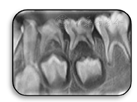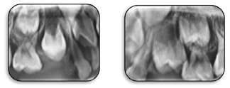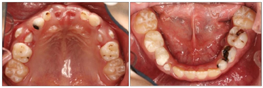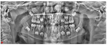 X线影像显示:73M、D透射影像,达牙本质中层,根尖周未见异常。74MOD透射影像,近髓腔,根分叉处可见透射影像,34恒牙胚硬骨板完整,根尖周未见异常。75DO透射影像,近髓腔,根分叉处可见透射影像。远中根尖周可见透射影像,波及35恒牙胚硬骨板。55O、P、65O、P龋坏,探诊质硬,冷诊正常,叩痛(-)。14、24萌出,松动I度,牙合面近远中向牙龈覆盖(图4)。