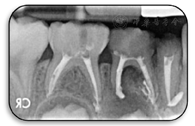 X线影像显示:85根管内阻射影像,达根尖,近中根管根尖有根充物溢出影像,根尖周未见透射影像。84根管内阻射影像,达根尖,远中根尖周有透射影像,波及44恒牙胚硬骨板,近中根尖有根充物溢出影像。83根管内阻射影像,致密,根尖有糊剂溢出,根尖周未见透射影像。73M、D、74MOD、75DO龋洞,发黑,探诊质硬,冷诊未诉不适,叩痛(-),根尖区黏膜无异常(图3)。