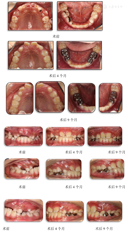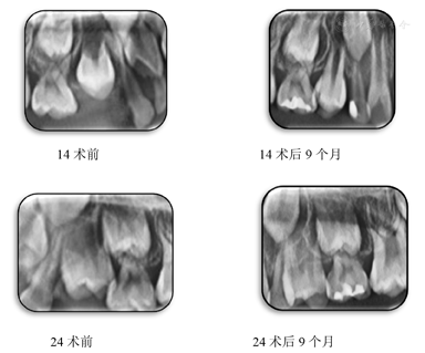 经过9个月的治疗与随访,患儿12、11、21、22萌出。74、75、84、85牙冠与邻牙邻接关系良好,行使功能正常。无新增龋齿。14、24无松动,与对颌牙建立咬合关系。牙弓长度、宽度有效保持。
