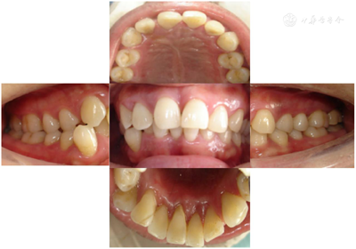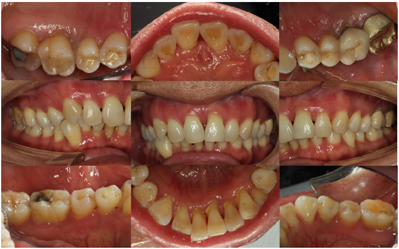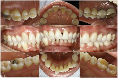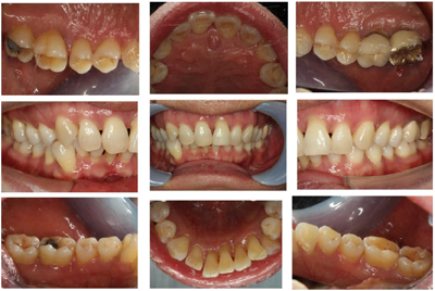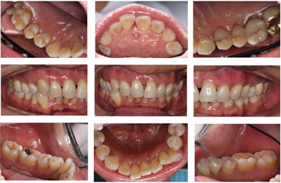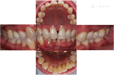 全口临床检查:口腔卫生状况一般,菌斑、软垢少量,下前牙舌侧可见新生牙石,龈下牙石(++)。牙龈色偏红,肿胀,形态圆钝,质软,尤以下前牙舌侧为重,出血指数3~4。全口牙齿探诊深度(PD)5~7 mm,个别位点8~9 mm。全口牙齿均可探及附着丧失,21、24、25、41、43松动I~Ⅱ。46合面金属色充填体,27烤瓷冠复体,近中悬突,可见食物嵌塞,叩痛(-)。咬合关系深覆合,下前牙多生牙,下前牙区拥挤,43位置颊倾,反合,见图1,图2,图3。