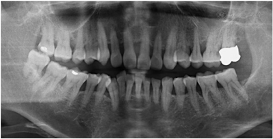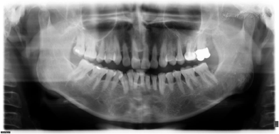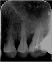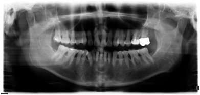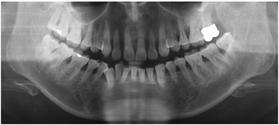 全口影像学检查:12~22、25~26、34~36、45~46牙槽骨吸收进一步加重,但下颌出现骨白线,26远中冠部低密度影像近髓腔,根尖周无低密度影像。