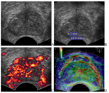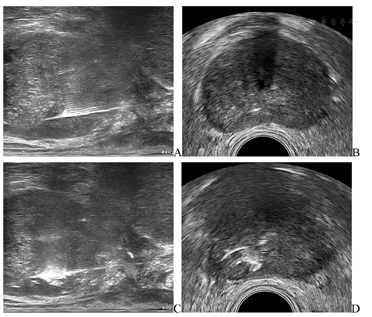 (1)经直肠超声(图1):前列腺右侧周缘区低回声结节,大小约13 mm×5 mm,无明显向前列腺包膜外隆起;结节内部血流信号丰富;弹性成像该低回声质地硬,评分4分。超声诊断:前列腺右侧周缘区实质性结节,前列腺癌可能,建议超声引导下穿刺活检。