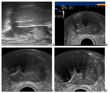 激光消融治疗(图4):由于形成的冰球在前列腺与直肠之间呈弧形,为避免直肠冻伤,在消融时会有部分前列腺组织未能完全冷冻,故本例在完成冷冻消融后,采用激光对前列腺右侧周缘区旁正中进行局部消融,仪器使用Elesta Echolaser (Esaote, Florence, Italy)激光诊疗仪,使用21G PTC针在经直肠超声引导下置于前列腺右侧周缘区旁正中,拔出针芯导入激光光纤进行激光消融,在经直肠超声监测下完成该部位消融,总能量2700 J,消融范围12 mm×8 mm。治疗完成后,会阴部加压包扎,撤出尿道保护装置,置入Foley留置导尿管,并于2周后拔管。
