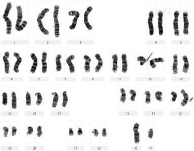一例由外周血细胞遗传学和分子分析诊断的性染色体不一致性嵌合体并伴有平衡易位病例,染色体核型为46,XY,t(11;18)(q21;q23)[54]/46,XX[46]。该患者表型为正常男性,因不育到长海医院生殖科就诊。根据染色体核型、荧光原位杂交(FISH)和全基因组SNP微阵列分析确定该嵌合体的类型。