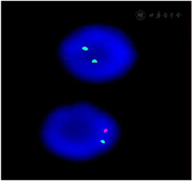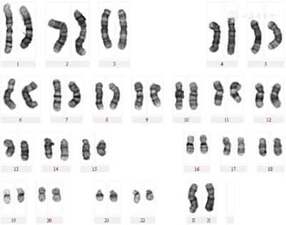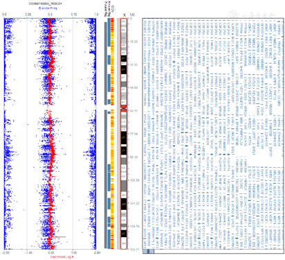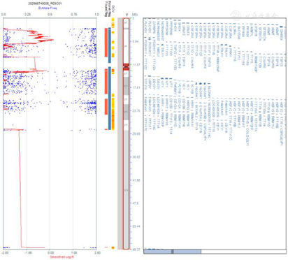 外周血染色体核型分析结果:46,XY,t(11;18)(q21;q23)[54]/46,XX[46](图1,图2);Y染色体微缺失检测,结果显示Y染色体AZFa(sY84)、AZFa(sY 86)、AZFb(sY 127)、AZFb(sY 134)、AZFc(sY 254)、AZFb(sY 255)六位点检测未见缺失;FISH检测结果细胞具有XX信号和XY信号(图3)。随后对患者外周DNA样本进行全基因组SNP微阵列分析,对染色体拷贝数进行分析,X染色体接近2拷贝数并且存在Y染色体,结果:arr[hg19]46,XY/46,XX,嵌合比例以46,XX为主,约90%,仅存在少量Y染色体成分,且常染色体同样存在嵌合,该种核型可导致性发育异常,出现性别反转,两性畸形,不育可导致性腺肿瘤风险升高(图4,图5)。