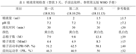 患者,男性,33岁,两次婚史,婚后性生活正常,2年未育。有弟、妹二人,均育有子女。就诊我院生殖科,行内分泌激素及相关腺体超声检查。专科检查正常男性外生殖器,B超显示:其超声可见与卵巢组织相似的囊实性回声,以及与睾丸组织相似的实性均匀回声同时存在。血清性激素检查:促黄体生成素8.50 U/L、促卵泡刺激素8.24 U/L、睾酮6.11 μg/L。精液常规及精子形态学分析检查:总精子数7.9 M、精子浓度4.4 M/ml。服用麒麟丸等药物调理后,先后于2018年10月29日和2018年11月13日进行两次精液常规及精子形态学分析检查,结果为:10月29日总精子数9.8 M,精子浓度4.9 M/ml;11月13日总精子数12.4 M,精子浓度8.3 M/ml,精液质量显著提高(见表1,表2,表3)。