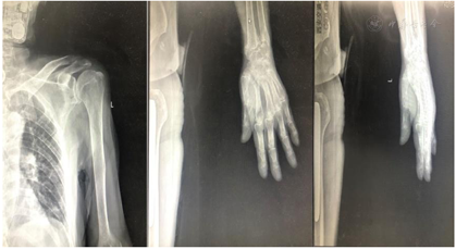 家属诉4个月余前行走时不慎被汽车撞倒在地,出现左侧髋部疼痛、活动受限,当时未有意识丧失,就诊于汉中市中心医院行X线检查示"左尺骨桡骨远端骨折,左股骨颈骨折",给予对症支持治疗,住院期间出现咳嗽、咳痰,吞咽困难,胸片"两肺中下野炎症可能,双侧少量胸腔积液",给予鼻饲饮食、气管切开、抗感染治疗,期间曾使用呼吸机。3个月前转至西安交大一附院骨科行"左侧股骨头置换术",术后一直于该院康复科行康复治疗。遗留左下肢活动受限,不能独自维持坐位、不能站立行走,左腕部活动疼痛,气管切开状态,仍有咳嗽、咳痰,体温正常,患者为行进一步康复治疗收住我科。患者自发病以来,神志清,精神欠佳,鼻饲饮食,夜修尚可,小便如常,大便肠造瘘状态,性质、量正常。