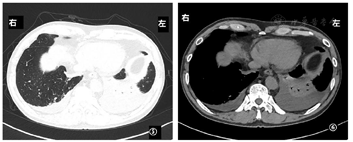 入院时体检:体温36.3℃,脉搏78次/分,呼吸20次/分,血压122/74 mmHg(1 mmHg = 0.133 kPa),外周SpO2(吸空气下)98%;颈部浅表淋巴结未触及肿大。呼吸节律规整,双肺叩诊清音,双肺呼吸音清,左下肺呼吸音稍减弱,未闻及干湿性啰音。心腹及四肢体查无异常。