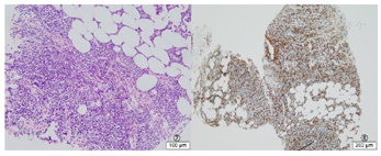 超声提示胸腔积液量少未能定位穿刺;浅表淋巴结彩超:双腹股沟及双颈部多发肿大淋巴结,最大约7~9 mm×15~19 mm,双侧腋窝超声未见肿大;经外科评估无法淋巴结活检。心脏彩超无异常,腹部彩超提示肝脾不大,余无异常。正电子发射计算机断层扫描(PET-CT):两肺门、纵隔、肝门区、腹膜后多发淋巴结增大,最大者14 mm×18 mm,SUVmax:10.1。双侧胸膜增厚,右侧胸膜多发小结节,双侧胸腔少量积液。